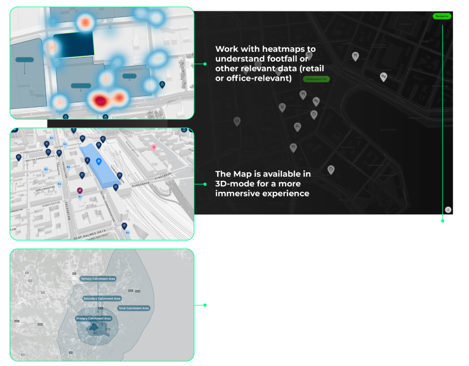 - Visualize footfall with heatmaps or illustrate future subway lines and connections