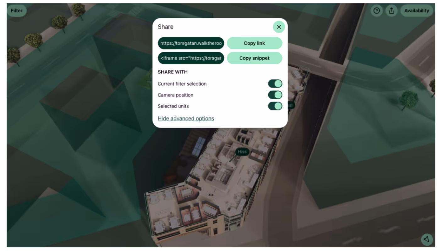 Customized share allows you to share specific viewpoints so that the only thing your prospect needs to do is click your specific link, and will hence land on your desired place in the solutions. Now you can also embed certain viewpoints directly into your website.