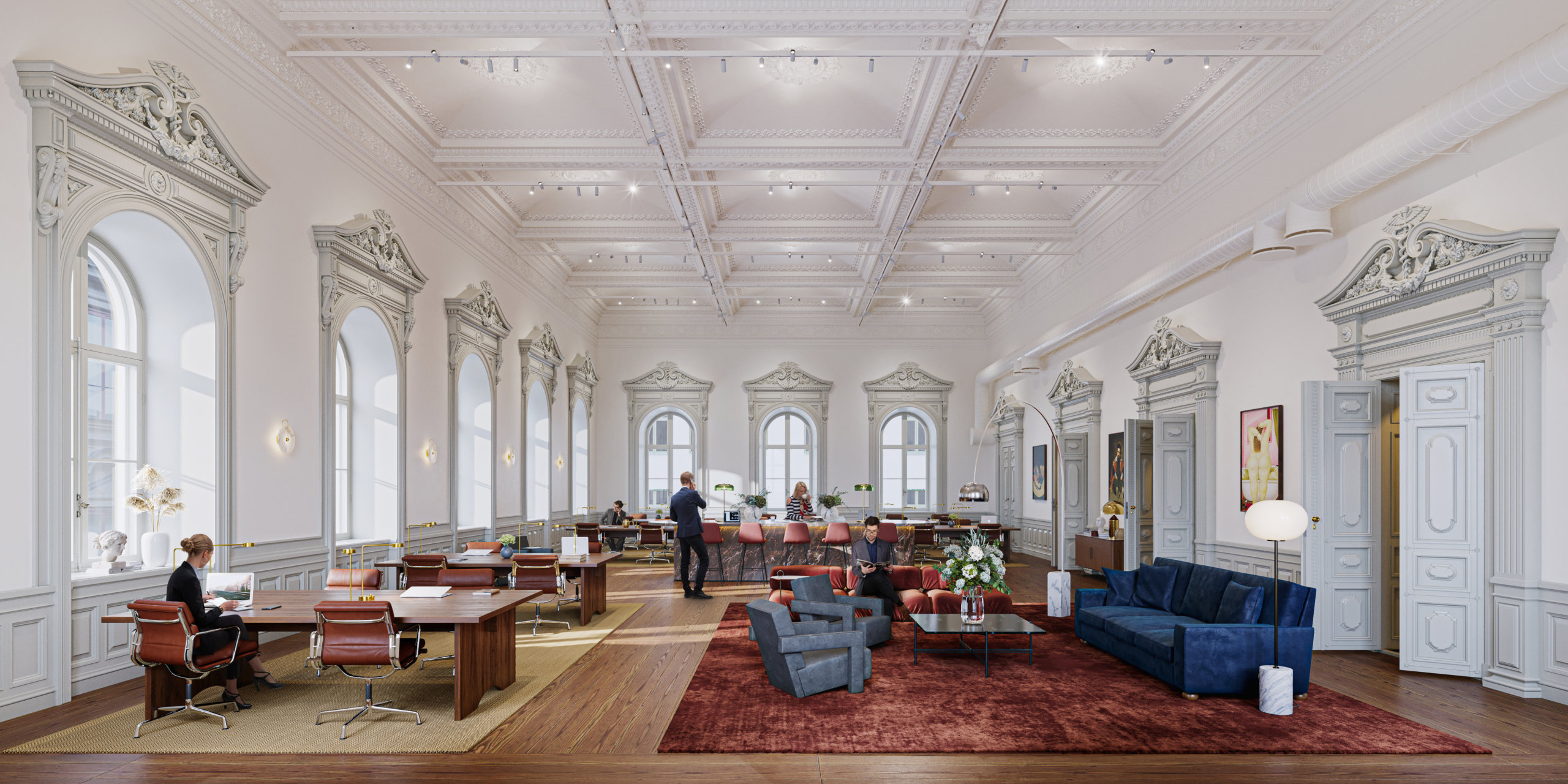 Built in 1860 and originally Stockholm's first private bank palace, the stunning Lion Shield Palace is currently undergoing a historical refurbishment aimed at carefully preserving the original details in the building - wooden doors and panels, original paintings, and details on the walls, ceilings, and around stucco. From the statement reception area to the painstaking restoration work required to preserve the original details, not a single thing has been left to chance. Once completed this unique property will house state-of-the-art office spaces while at the same time preserving its historic charm.
